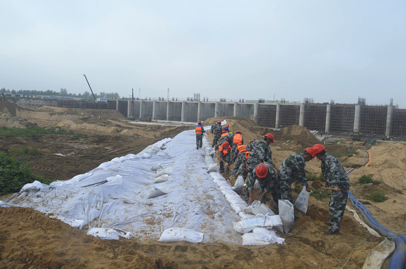 防洪度汛演練模擬的是洪水來襲,值班人員巡視圍堰時發(fā)現(xiàn)薄弱處有決口的危險,值班人員迅速向報告,召集搶險大隊成員攜帶防汛工具和物資迅速集結,通過填筑沙袋、拋石、打樁等措施消除圍堰隱患,保證了工程安全。