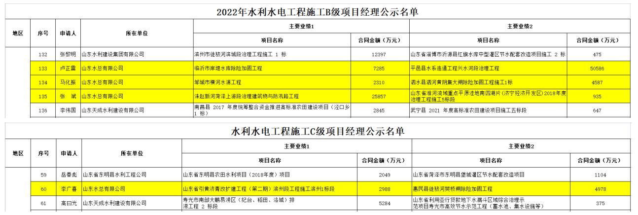 近日,中國水利企業(yè)協(xié)會發(fā)布《2022年水利水電工程施工項目經(jīng)理評價等級公示》,我公司盧正雷、馬化振、張斌三名同志被評為“2022年水利水電工程施工B級項目經(jīng)理”,李廣喜被評為“2022年水利水電工程施工C級項目經(jīng)理”。