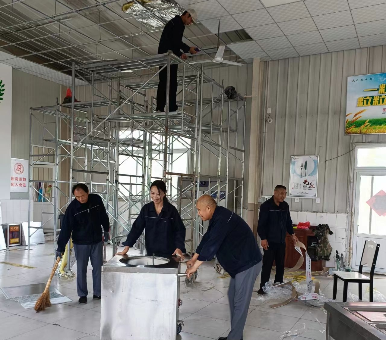 在施工現(xiàn)場,勞務公司黨員干部帶領員工及外聘人員對食堂進行吊頂裝飾,安裝吊筋、龍骨、面板,穿管線布線等。曲阜基地食堂屋頂原是彩鋼瓦單層裝配結構,冬不保暖、夏不隔熱,有些部位已經腐蝕生銹,甚至彎曲變形。本次餐廳升級用輕鋼龍骨和硅鈣板加巖棉吊頂,用木質龍骨和pvs板裝飾灶房,既達到隔熱保溫效果,又最大程度節(jié)約了成本,解決了夏天酷熱、冬天寒冷的就餐問題。