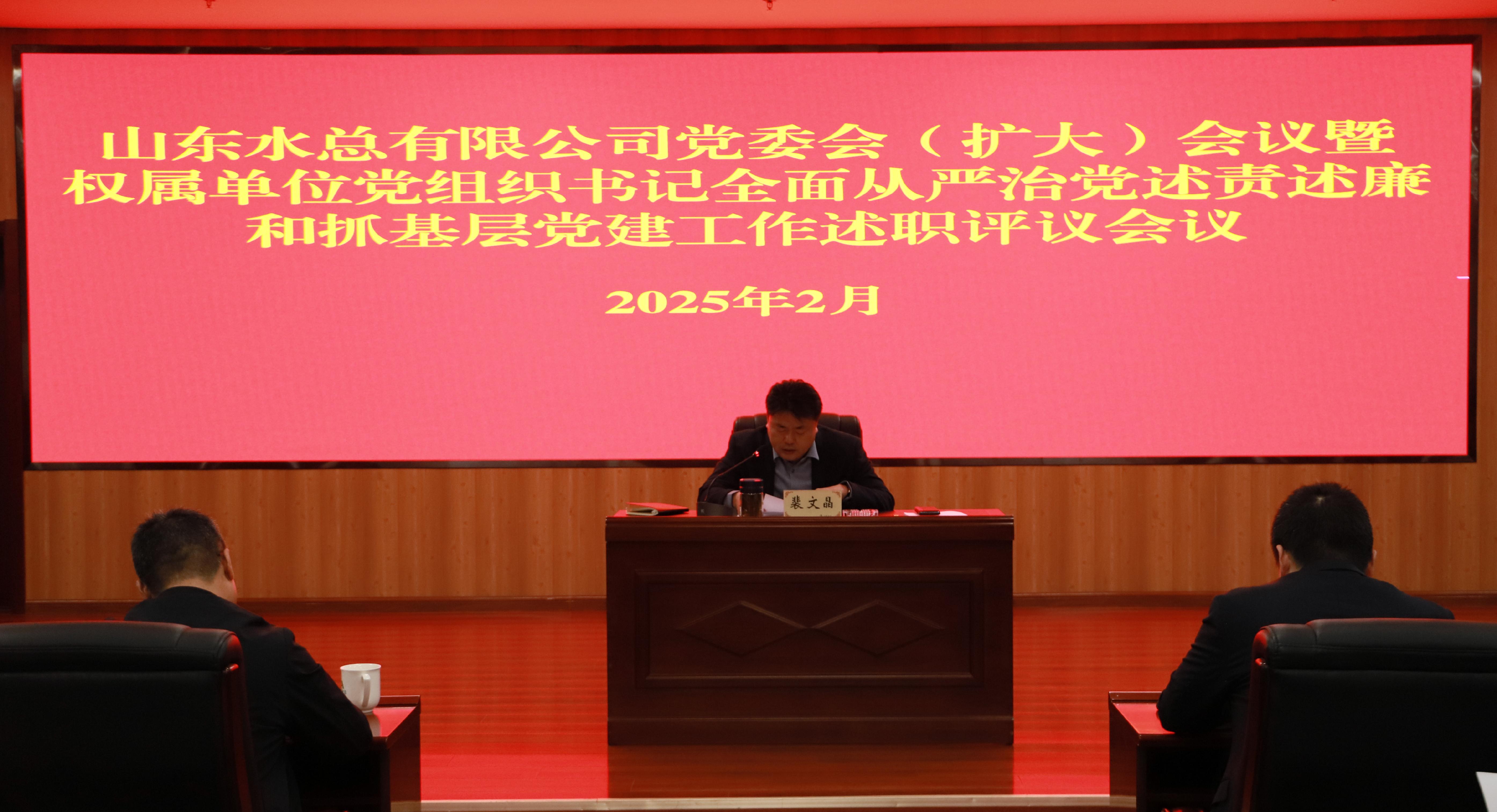 2月6日,山東水總有限公司召開黨委(擴(kuò)大)會(huì)議,分別聽取權(quán)屬單位黨支部書記2024年度全面從嚴(yán)治黨述責(zé)述廉和抓基層黨建工作述職,并進(jìn)行現(xiàn)場(chǎng)評(píng)議。山東水總有限公司黨委書記、董事長(zhǎng)裴文晶同志主持會(huì)議并講話,公司黨委班子成員及高管、總部有關(guān)部室負(fù)責(zé)人及權(quán)屬單位黨組織書記和基層黨員代表參會(huì)。