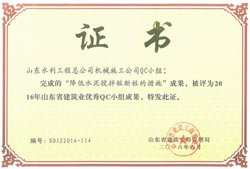 公司“降低水泥攪拌樁斷樁的措施”等三項成果榮獲2016年山東省建筑業(yè)優(yōu)秀QC小組