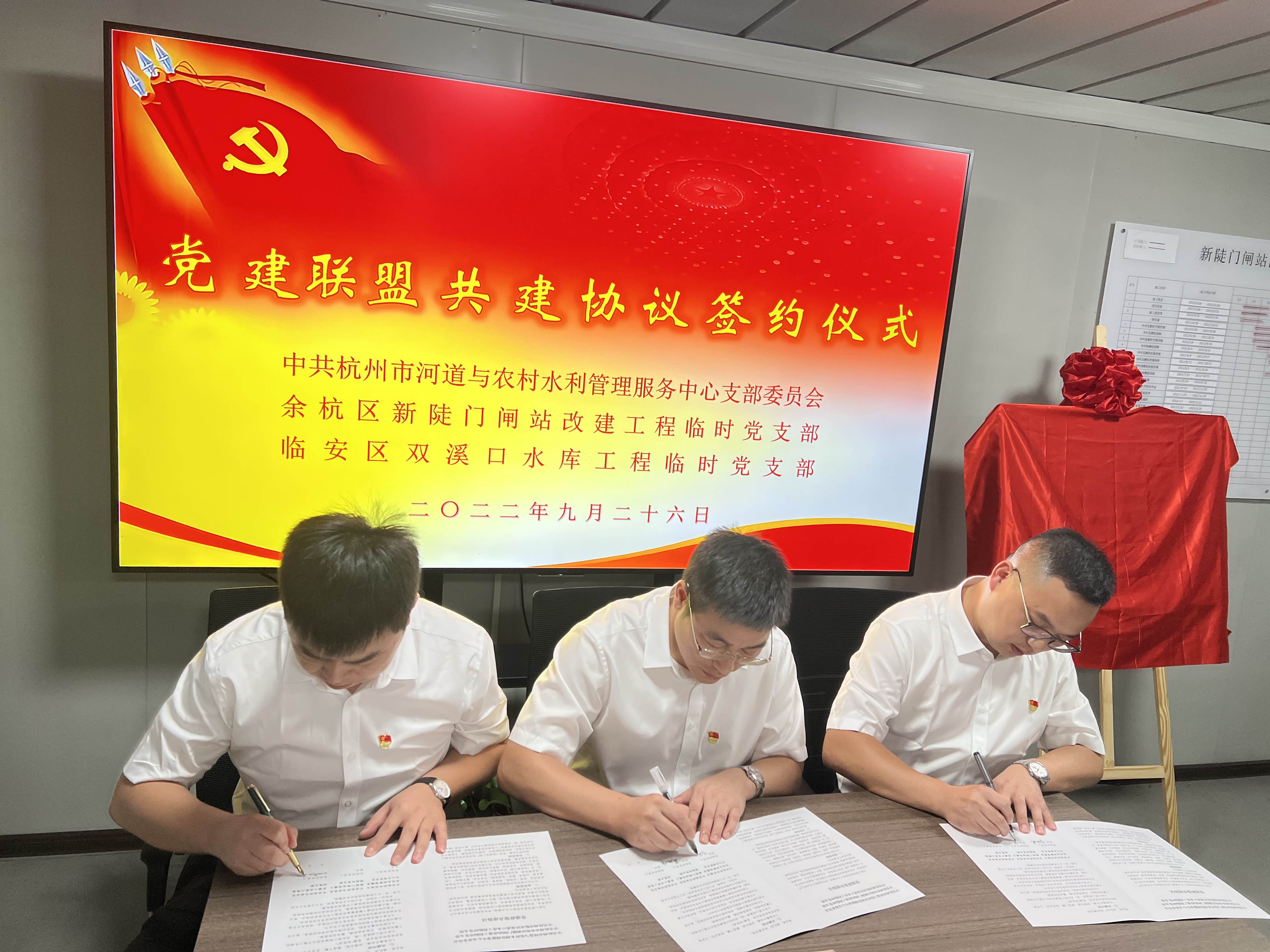 9月26日,中共杭州市河道與農(nóng)村水利管理服務中心支部委員會、中共杭州市余杭區(qū)新陡門閘站改建工程臨時黨支部、中共杭州市臨安區(qū)雙溪口水庫工程臨時黨支部在新陡門閘站改建工程現(xiàn)場舉行黨建聯(lián)建協(xié)議簽約儀式。市農(nóng)水中心支部書記、主任葉利偉,余杭區(qū)林水局黨委委員、二級調(diào)研員徐偉林,臨安水利局機關(guān)黨委副書記、紀檢書記劉勇,新陡門閘站改建工程臨時黨支部書記葛旭峰,雙溪口水庫工程臨時黨支部書記孟天琦及各支部代表參加簽約活動。