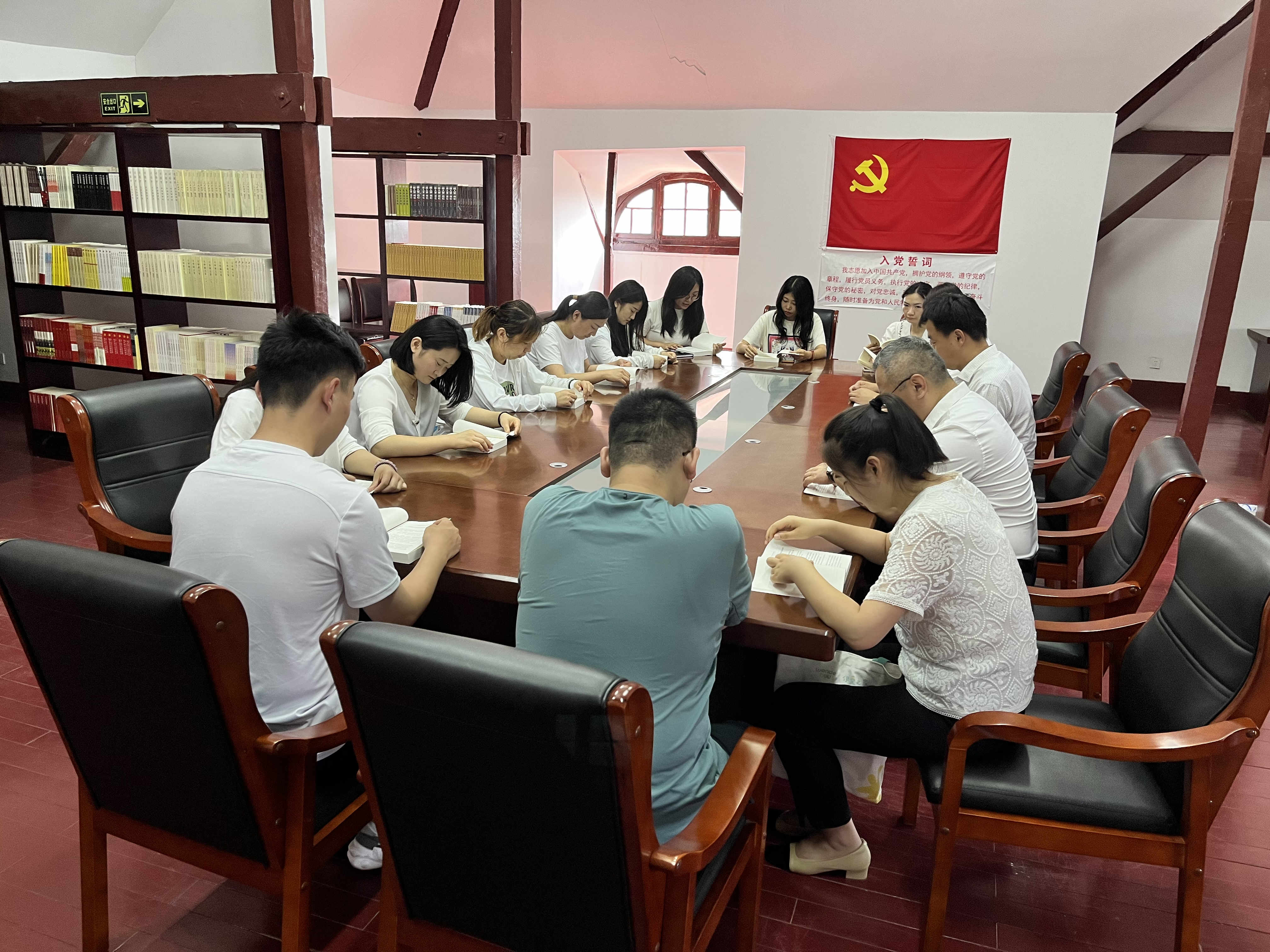 參觀結(jié)束后,全體黨員面對黨旗,舉起右手,莊嚴(yán)宣誓,大家的心一如加入中國共產(chǎn)黨的那一刻赤誠。隨后在紀(jì)念館閱覽室開展了一次特殊的主題教育集中學(xué)習(xí),共同學(xué)習(xí)了《習(xí)近平新時代中國特色社會主義思想專題摘編》部分章節(jié)內(nèi)容,并結(jié)合本次參觀內(nèi)容暢談心得體會。