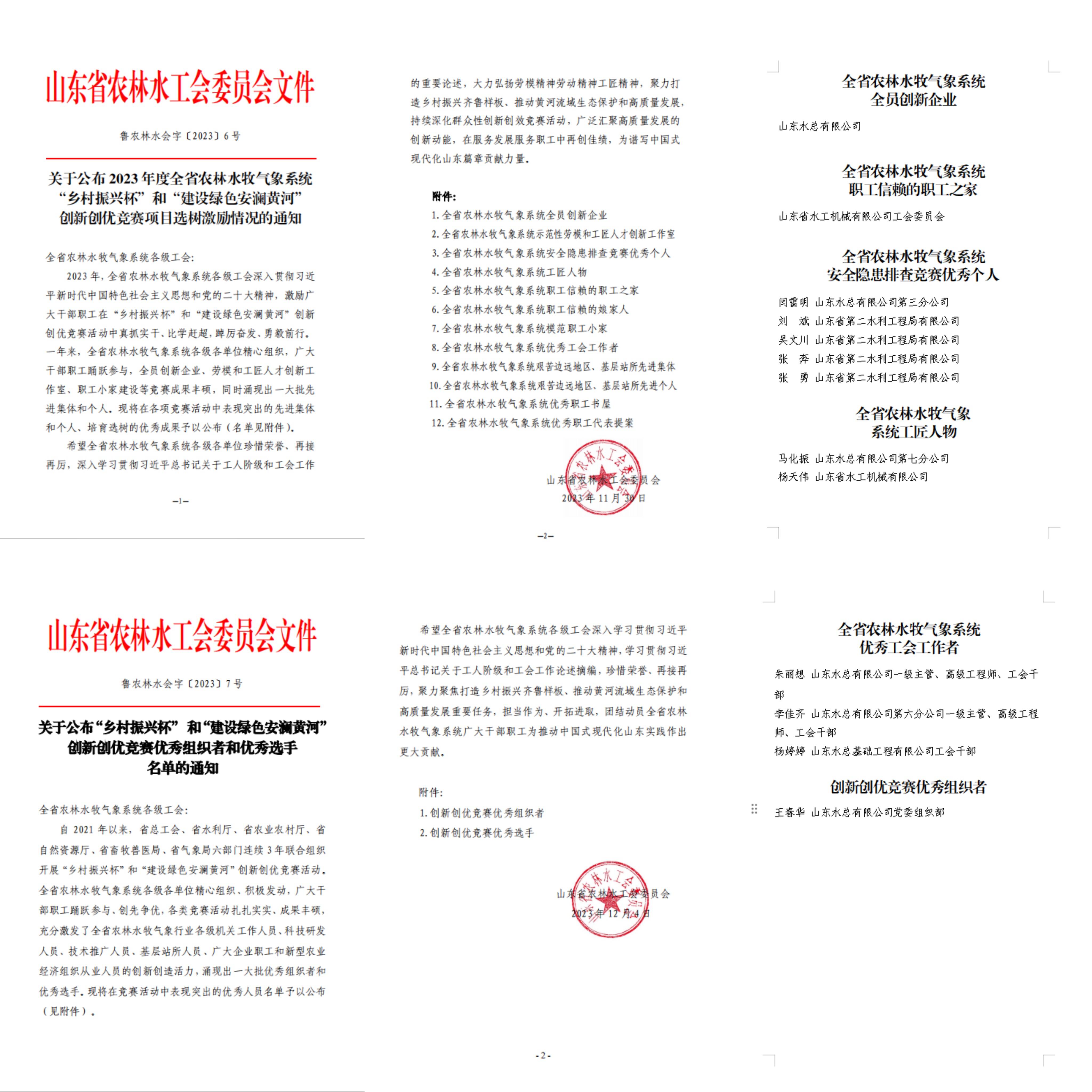 近日,山東省農(nóng)林水工會(huì)下發(fā)了《關(guān)于公布 2023 年度全省農(nóng)林水牧氣象系統(tǒng)“鄉(xiāng)村振興杯”和“建設(shè)綠色安瀾黃河”創(chuàng)新創(chuàng)優(yōu)競(jìng)賽項(xiàng)目選樹(shù)激勵(lì)情況的通知》《“鄉(xiāng)村振興杯” 和“建設(shè)綠色安瀾黃河”創(chuàng)新創(chuàng)優(yōu)競(jìng)賽優(yōu)秀組織者和優(yōu)秀選手名單的通知》,山東水總榮獲全省農(nóng)林水牧氣象系統(tǒng)全員創(chuàng)新企業(yè),水工機(jī)械公司工會(huì)榮獲“職工信賴的職工之家”,11人分別榮獲“職工安全隱患排查競(jìng)賽優(yōu)秀個(gè)人”“工匠人物”“優(yōu)秀工會(huì)工作者”“創(chuàng)新創(chuàng)優(yōu)競(jìng)賽優(yōu)秀組織者”等稱(chēng)號(hào)。