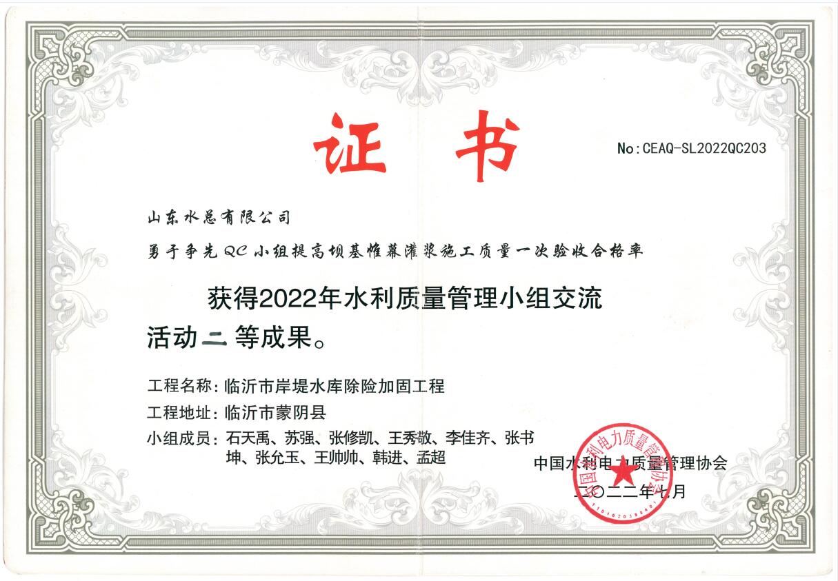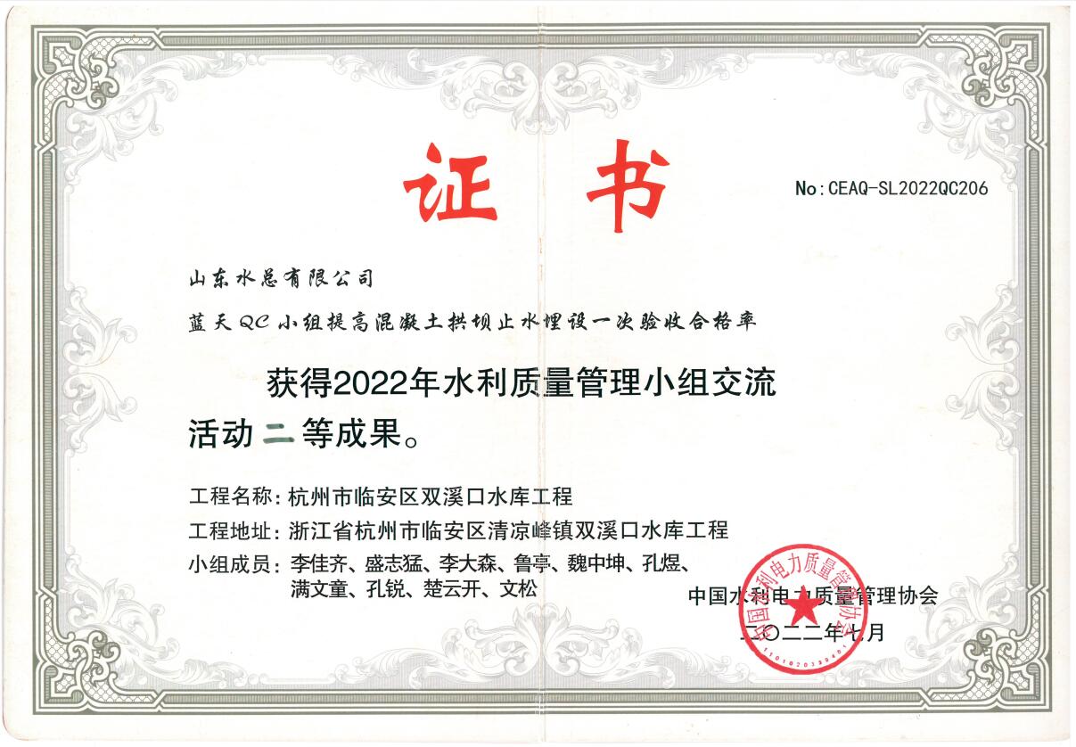 近日,中國水利電力質量管理協(xié)會2022年水利質量管理小組交流活動結果與獲獎名單揭曉,公司申報的《提高鋼壩閘閘墻外觀質量一次驗收合格率》獲得一等成果、《提高混凝土拱壩止水埋設一次驗收合格率》《提高大體積現澆混凝土強約束區(qū)溫度控制水平》《提高壩基帷幕灌漿施工質量一次驗收合格率》3項成果獲得二等成果。