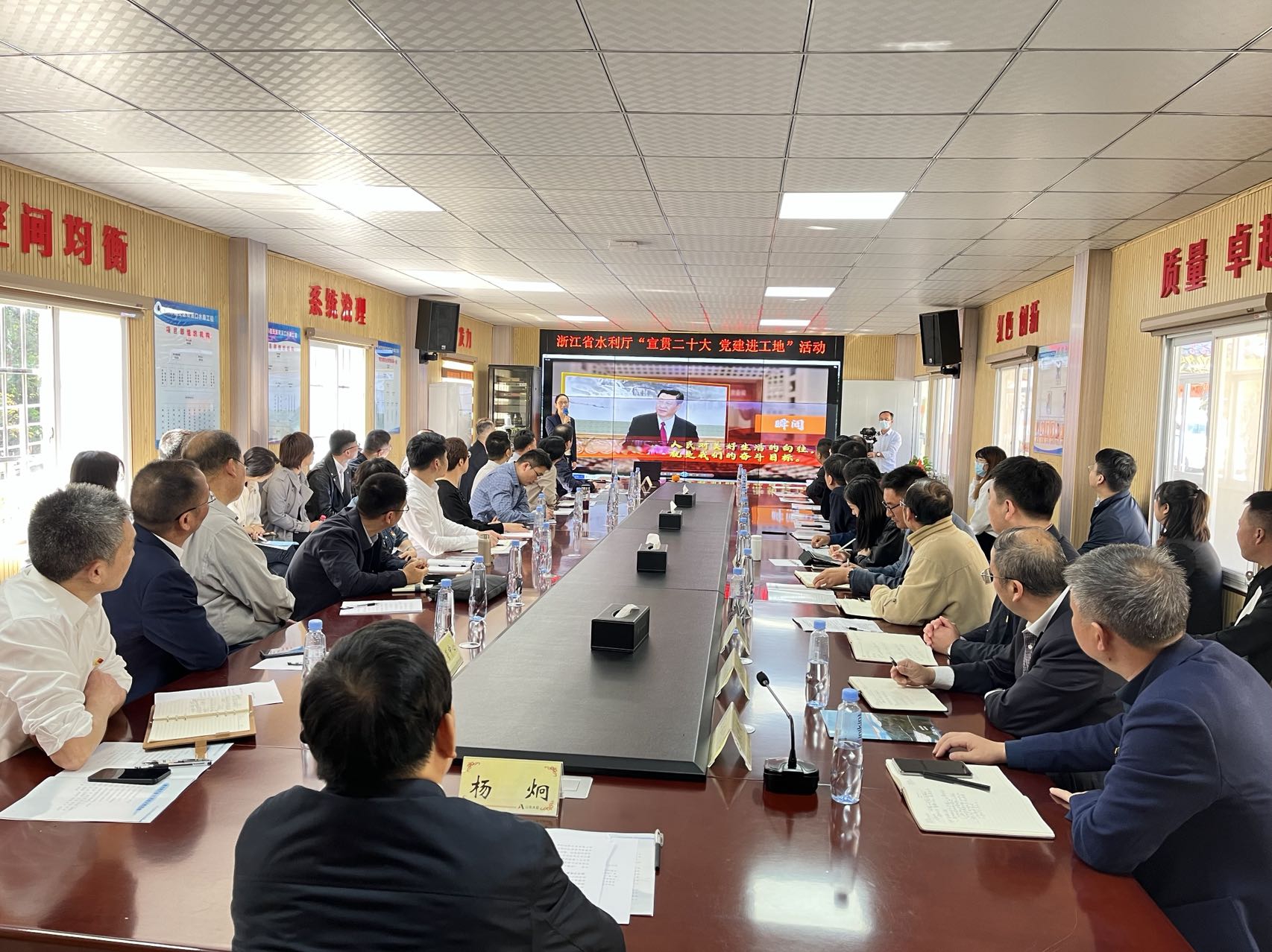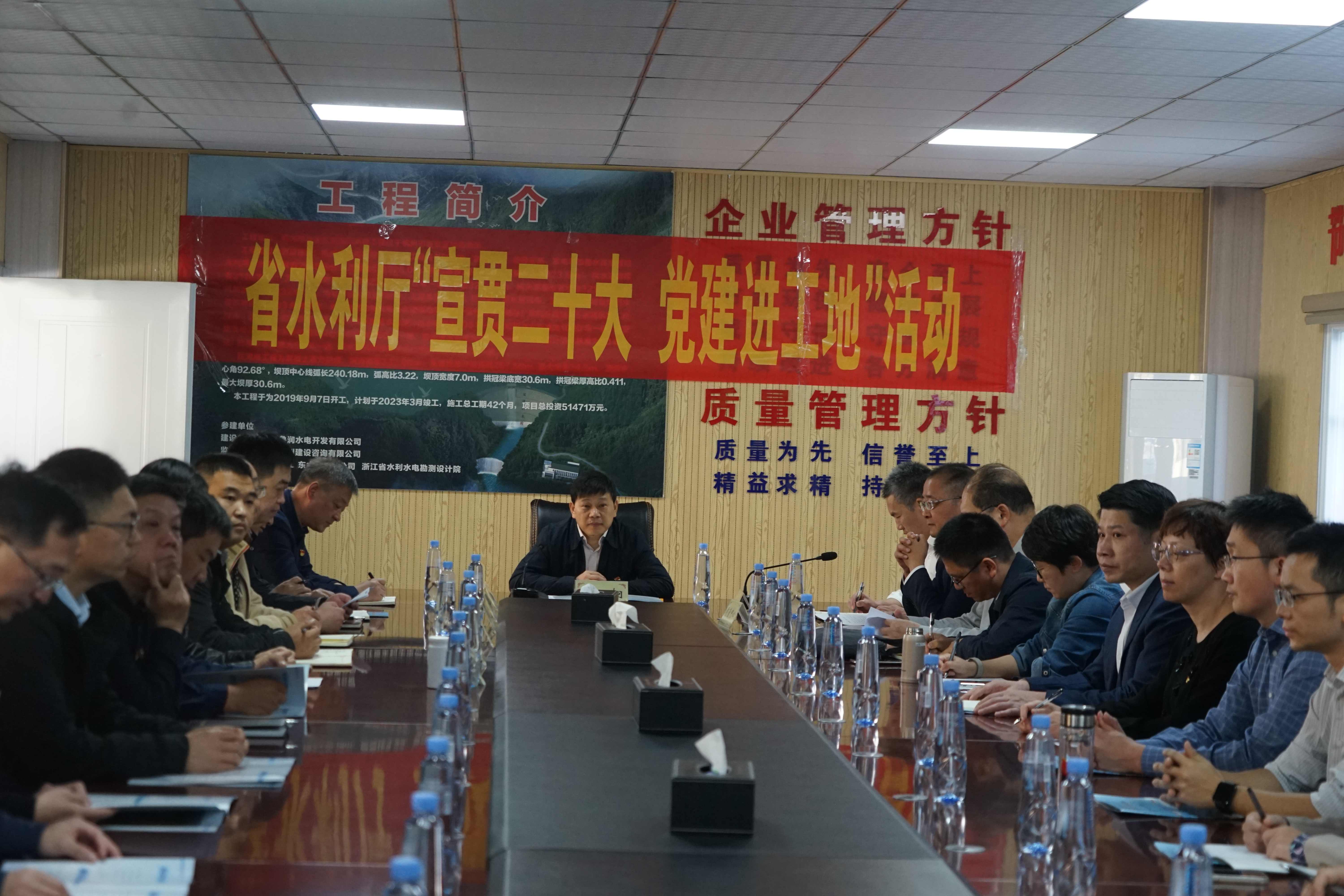 11月10日,浙江省水利廳副廳長(zhǎng)楊炯率省水利廳建設(shè)處、質(zhì)管中心等負(fù)責(zé)同志到雙溪口水庫工程開展“宣貫二十大 黨建進(jìn)工地”活動(dòng)。此次活動(dòng)旨在把黨建課堂搬到工程建設(shè)現(xiàn)場(chǎng),把宣講“二十大”深入基層,充分激發(fā)廣大工程建設(shè)者建功新時(shí)代的積極性、主動(dòng)性、創(chuàng)造性。