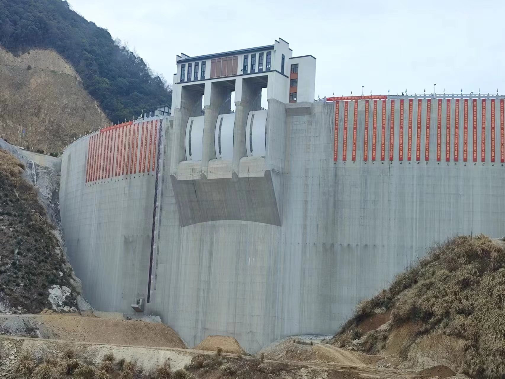 在臨安區(qū)委、區(qū)政府的正確領(lǐng)導(dǎo)下,在臨安區(qū)水利水電局和工程建設(shè)指揮部的精心組織和指導(dǎo)下,山東水總作為社會資本方與政府股東方臨安水利開發(fā)公司迅速完成了項目公司組建及參建單位招標(biāo)工作,高標(biāo)準(zhǔn)、高質(zhì)量推進(jìn)項目建設(shè),將安全文明標(biāo)準(zhǔn)化、黨建引領(lǐng)和科技創(chuàng)新融入到項目建設(shè)的全過程,先后榮獲了“浙江省水利文明標(biāo)準(zhǔn)化工地”和“黨建進(jìn)工地”示范工程,獲得了1項水利行業(yè)工法、6項發(fā)明專利和9項QC成果,2項科技成果被工信廳立項。特別是施工期間克服了新冠疫情、超長汛期、料場重大設(shè)計變更及高壩、拱壩施工技術(shù)難度大等不利因素影響,歷經(jīng)1650天的日夜奮戰(zhàn),終于迎來了雙溪口水庫下閘蓄水這一重要時刻。