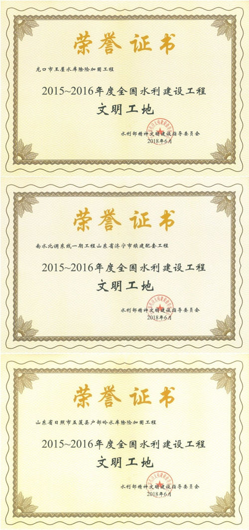 公司“龍口市王屋水庫除險(xiǎn)加固工程”等項(xiàng)目榮獲“2015-2016年度全國水利建設(shè)工程文明工地”稱號(hào)